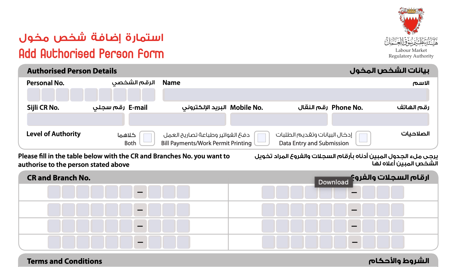 تُطلب استمارة إضافة شخص مخول في العديد من المؤسسات الحكومية البحرينية لضمان أن الشخص الذي يتعامل مع الجهة الرسمية لديه صلاحية قانونية واضحة.