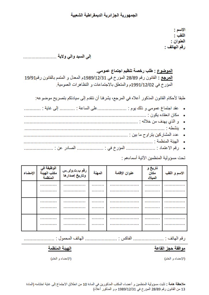 تحميل نموذج طلب رخصة اجتماع عمومي PDF