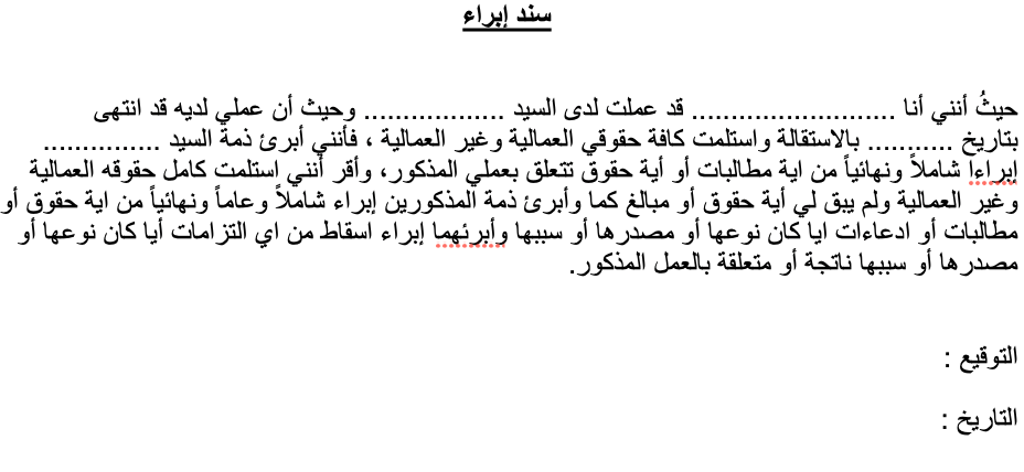| انتهاء علاقة العمل | يوقع الموظف سند إبراء بعد استلام حقوقه |