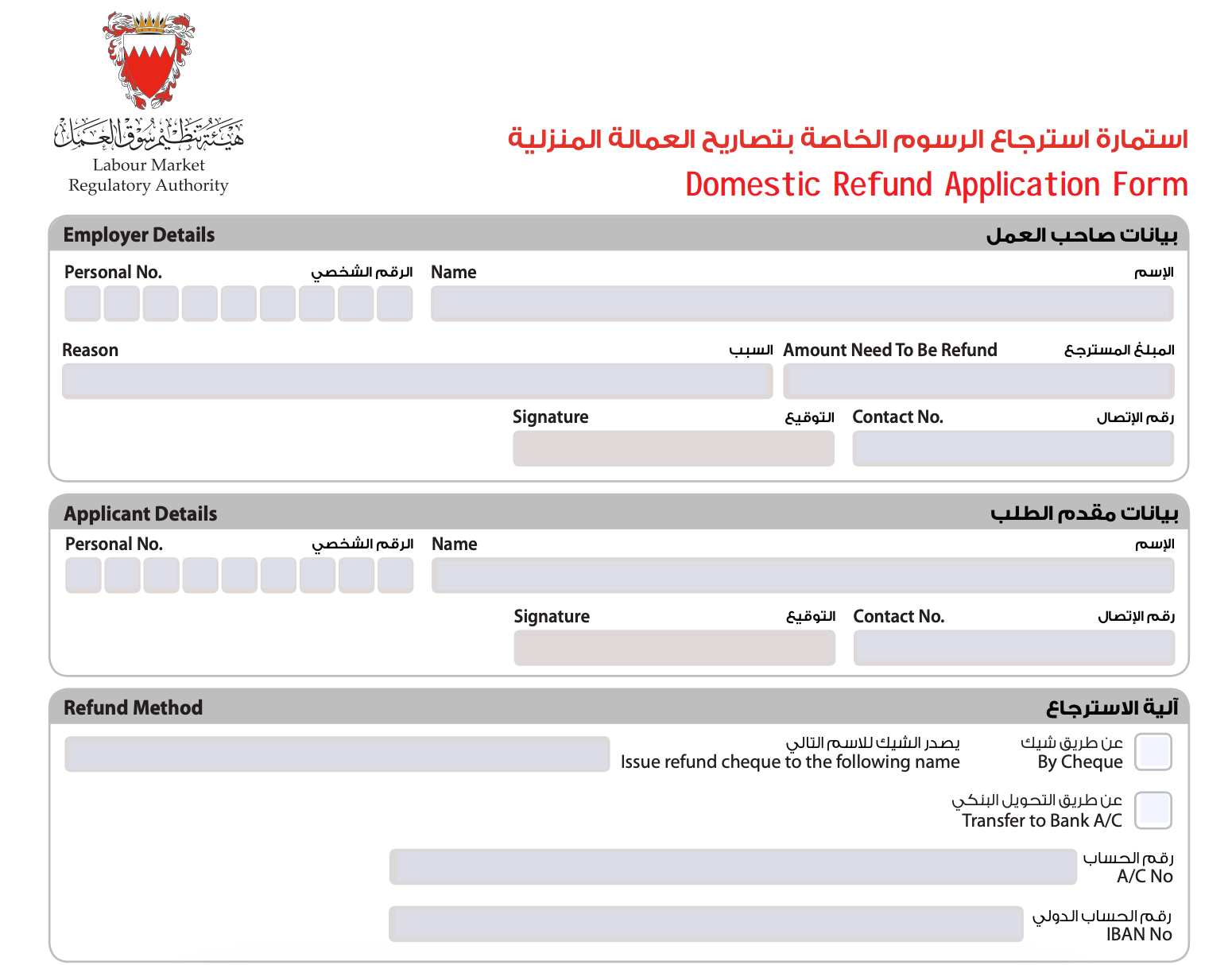 استمارة استرجاع الرسوم الخاصة بتصاريح العمالة المنزلية الاسم الكامل لصاحب العمل: ............................ رقم الهوية البحرينية: ................................... العنوان: ................................................ رقم الهاتف: ............................................. بيانات العامل المنزلي: الاسم: .................................................. رقم تصريح العمل: ........................................ سبب طلب استرجاع الرسوم: .......................................................... المبلغ المطلوب استرجاعه: ................................... رقم الحساب البنكي (إن وجد): ............................... التاريخ: .................................................. توقيع مقدم الطلب: .......................................