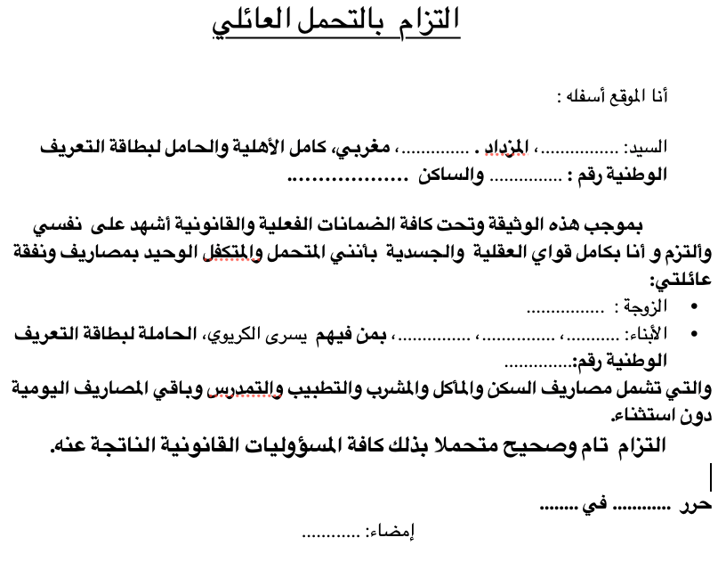 في العديد من الإجراءات الإدارية والقضائية داخل المغرب، يحتاج المواطن إلى وثيقة تثبت تحمله للمسؤوليات الأسرية تجاه أحد أفراد العائلة، وهنا تظهر أهمية التزام بالتحمل العائلي كوثيقة قانونية معترف بها لدى الإدارات والمؤسسات. هذا النموذج يُستعمل لإثبات النفقة أو التكفل المادي بشخص معين سواء لأغراض اجتماعية أو قانونية أو إدارية.