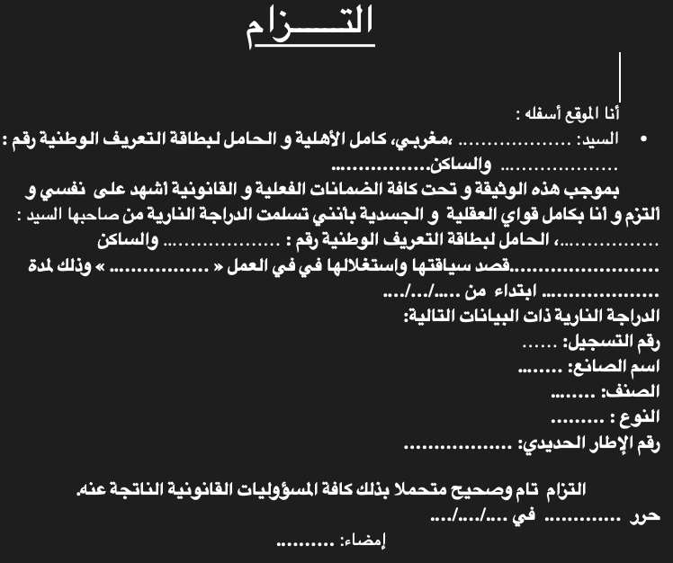 هو تصريح كتابي يلتزم فيه صاحب الدراجة ثلاثية العجلات باستعمالها في إطار مهني مشروع مع احترام القوانين المنظمة للنقل والسلامة الطرقية. يعتبر هذا الالتزام وثيقة إدارية داعمة تُرفق بملفات الترخيص أو التسوية المهنية.