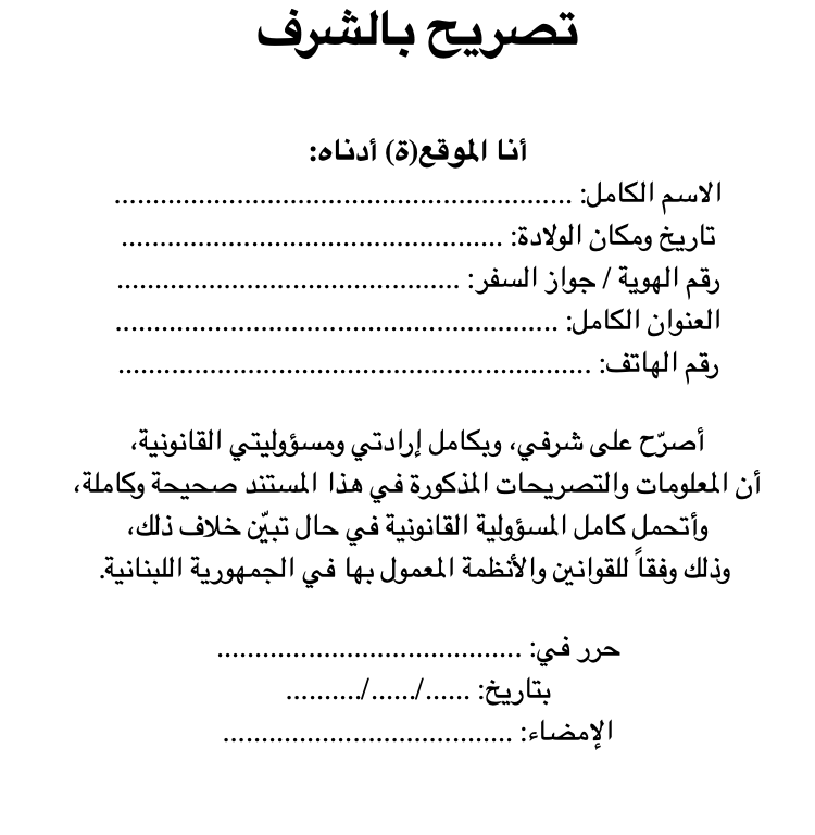 تـصـريـح بـالـشـرف أنا الموقع أدناه، ............................................، والدتي: .........................، سجل رقم: .........................، رقم السجل العدلي/الهوية: .........................، المقيم حالياً في: .........................، قضاء: .........................، أصرح بشرفي، وأنا بكامل قواي العقلية وبإرادتي الحرة، بأنني: .......................................................................................................... (مثلاً: لا أتقاضى أي راتب من أي جهة عامة أو خاصة / أو مقيم في العنوان المذكور أعلاه) .......................................................................................................... وأتعهد بإبلاغ المرجع المختص عن أي تغيير يطرأ على هذه المعلومات. كما أقر بعلمي التام بأن أي كذب أو إخفاء للحقيقة في هذا التصريح يعرضني للملاحقة القانونية أمام المحاكم اللبنانية المختصة بتهمة الإدلاء بإفادة كاذبة. بناءً عليه، أوقع هذا التصريح لاستخدامه عند الحاجة. حرر في: .................... بتاريخ: ..../..../2026 توقيع المصرح: ............................