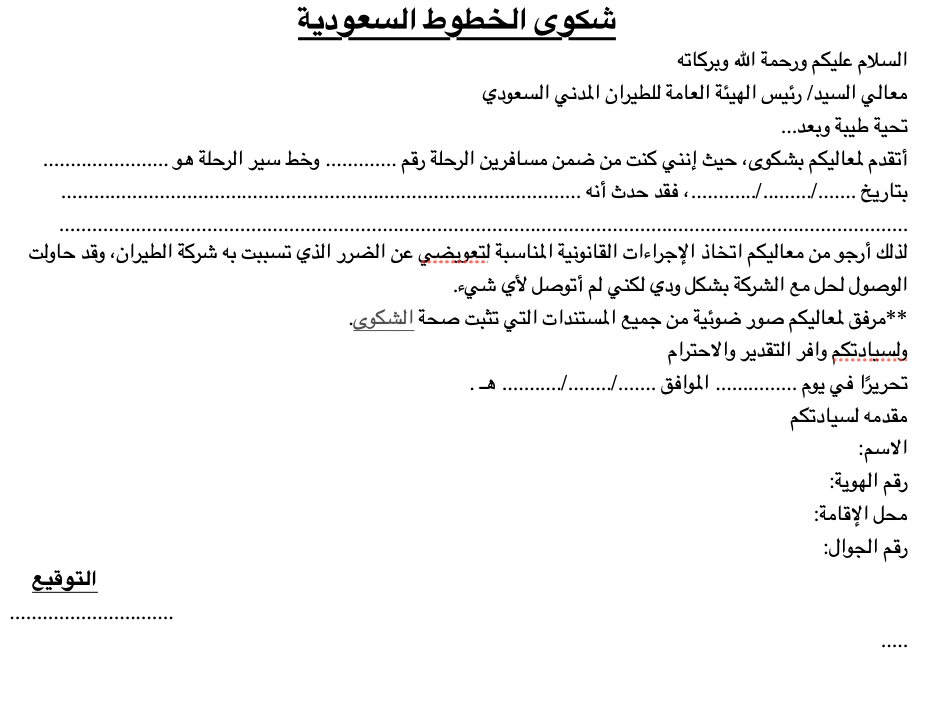 نموذج خطاب شكوى ومطالبة بتعويض – الخطوط السعودية